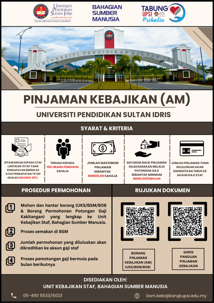 Rujuk garis panduan lengkap bagi permohonan pinjaman kebajikan kepada staf UPSI dan tanggungan yang layak.
